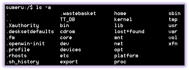 ตัวอย่าง แสดงการใช้คำสั่ง ls -a เพื่อแสดงรายชื่อไฟล์ในระบบของ UNIX โดยการพิมพ์คำสั่งต้องคำนึงถึงอักษรตัวเล็กและตัวใหญ่ด้วย เพราะ UNIX ถือว่าเป็นอักขระคนละตัว