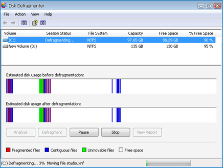 ไฟล์ที่มีขนาดใหญ่จะถูกแบ่งเก็บในคลัสเตอร์กระจายไปทั่วฮาร์ดดิสก์ ทำให้ระหว่างที่มีการบันทึก แก้ไข หรือลบไฟล์ในฮาร์ดดิสก์ จะมีพื้นที่ว่างกระจัดกระจายไปทั่ว ทำให้หัวอ่านของฮาร์ดดิสก์ต้องทำงานหนักและใช้เวลาในการเข้าถึงข้อมูลนาน ขึ้นโปรแกรม Disk Defragmenter จะช่วยในการจัดเรียงข้อมูลในฮาร์ดดิสก์ ไม่ให้กระจัดกระจายไปทั่ว