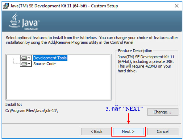 กำหนดพาทสำหรับติดตั้งโปรแกรม พื้นฐานเครื่องจะถูกติดตั้งไว้ที่ C:\Program Files\Java\jdk-11
