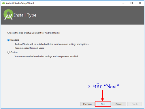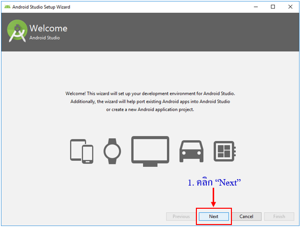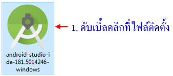หลังจากที่ดาวน์โหลดตัวติดตั้ง Android Studio มาแล้ว ให้ดับเบิ้ลคลิกเพื่อเริ่มติดตั้ง Android Studio ใน มีขั้นตอนดังนี้