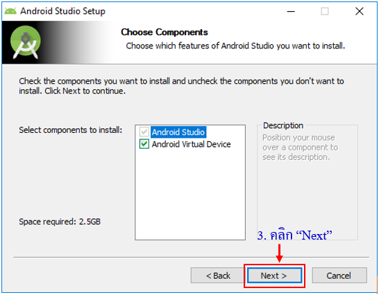 กำหนดพาทสำหรับติดตั้ง พื้นฐานเครื่องจะถูกติดตั้งไว้ที่ C:\Program Files\Android\Android Studio