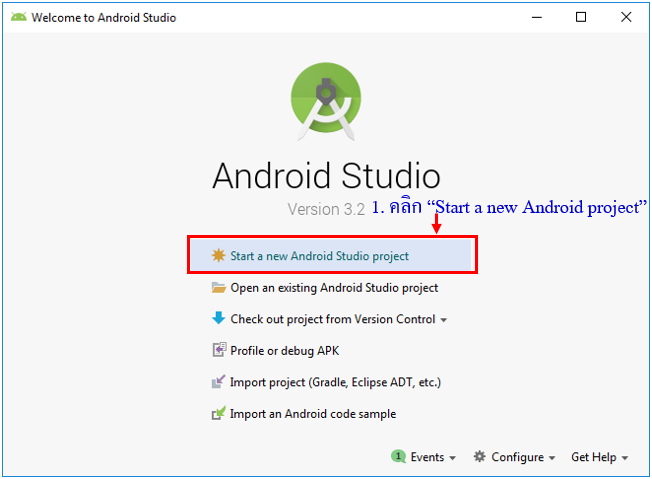 1. เรียกโปรแกรมแอนดรอยด์สตูดิโอขึ้นมาทำงาน จากนั้นคลิก Start a new Android Studio project