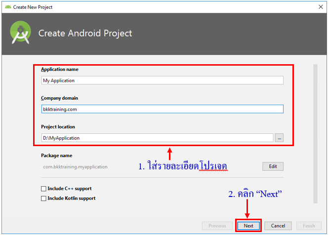 • Project location สำหรับให้ระบุโฟลเดอร์ที่ต้องการใช้จัดเก็บไฟล์ต่างๆ ของโปรเจคนี้ ในที่นี้จะใช้รูปแบบตามนี้ หรือสามารถเปลี่ยนที่อยู่ (path) ได้ เช่น D:\MyApplication คลิก Next เพื่อไปยังขั้นตอนถัดไป