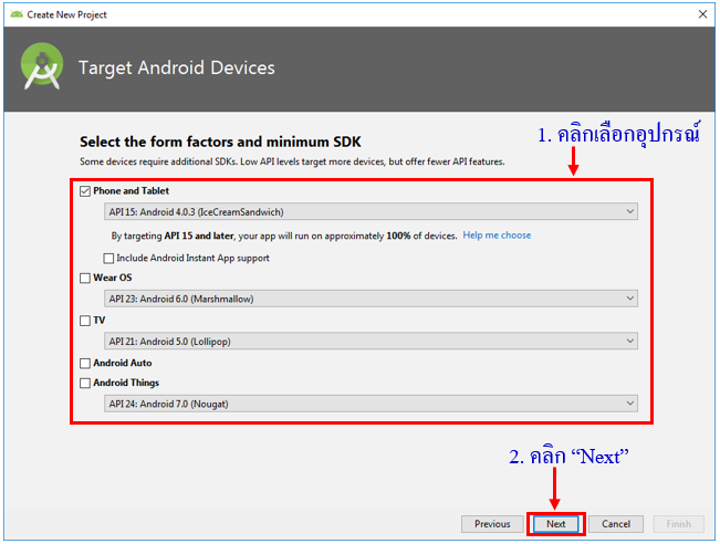 3. ถัดมาหน้าจอ Target Android Devices สำหรับระบุว่าต้องการสร้างแอพที่รันบนอุปกรณ์ประเภทใดบ้าง รวมทั้งเวอร์ชั่นขั้นต่ำของแอนดรอยด์ที่สามารถรันแอพได้ โดยยิ่งระบุเวอร์ชั่นต่ำเท่าใด ก็จะยิ่งมีจำนวนอุปกรณ์ที่รันแอพได้มากขึ้นเท่านั้น อย่างไรก็ตามไม่ควรเลือกค่าที่ต่ำเกินไป เพราะจะทำให้ฟังก์ชั่นความสามารถใหม่ๆ ไม่สามารถใช้งานได้