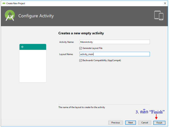 โดยจุดเริ่มต้นนี้ให้ใช้ค่าที่เครื่องตั้งให้ จากนั้นคลิก Finish เพื่อดำเนินการสร้างโปรเจค