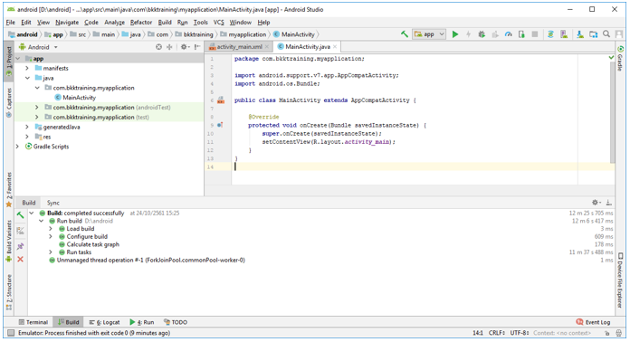 5. เครื่องจะสร้างแอพให้ เมื่อเสร็จเรียบร้อยแล้ว จะเข้าสู่หน้าต่าง Android Studio ดังรูป