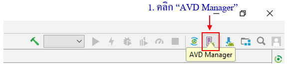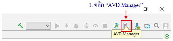การสร้างอีมูเลเตอร์ (Emulator) สามารถทำได้ดังขั้นตอนต่อไปนี้ 1. ขณะที่อยู่ในโปรแกรม Android Studio ทำการเปิด ADV Manager โดยคลิกที่ปุ่มแถบ ดังรูป