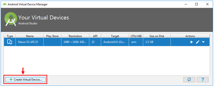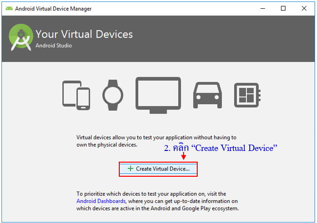 2. คลิกปุ่ม Create Virtual Device เพื่อเริ่มต้นสร้างอีมูเลเตอร์ (Emulator)