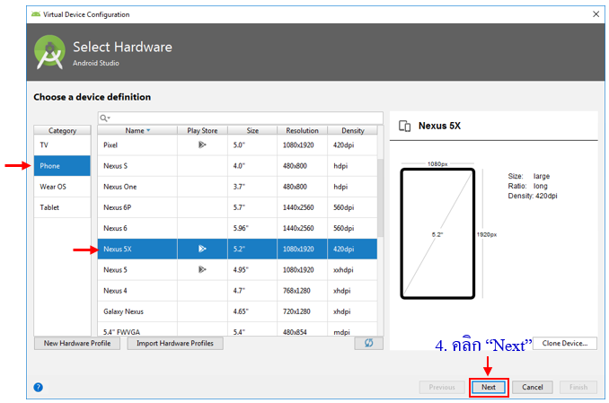 3. การกำหนดประเภทของอีมูเลเตอร์ ที่ต้องการสร้างขึ้นมา ในกรณีนี้เราต้องการทดสอบ Android Apps สำหรับมือถือ จึงเลือกหัวข้อ Phone ให้เลือกขนาดหน้าจอและความละเอียดตามที่ต้องการ