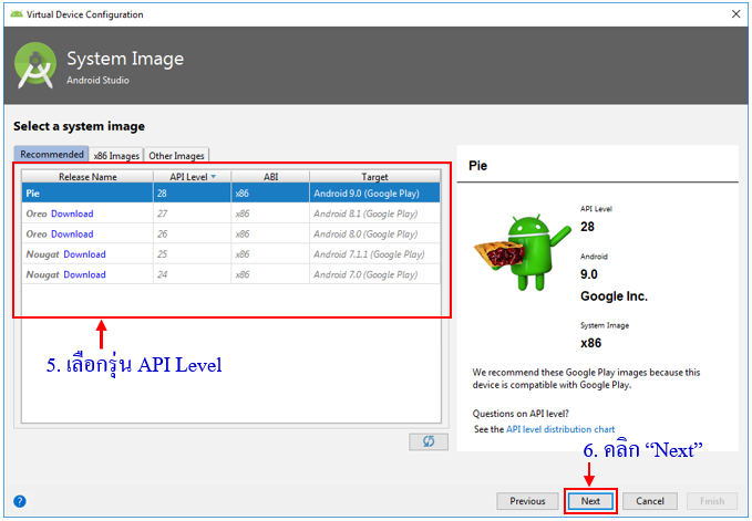 4. เลือกรุ่น API Level (ถ้ายังไม่ได้ Download ให้คลิกที่ Download ตัวสีฟ้า)