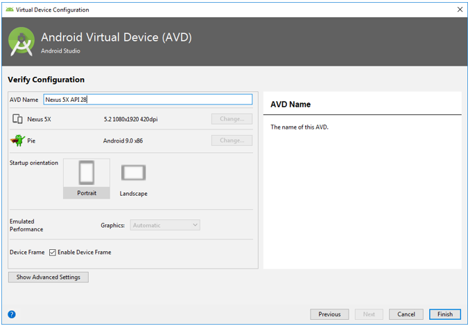 5. ต่อมาเป็นขั้นตอนการตั้งชื่อให้กับอีมูเลเตอร์ (ใช้ตอนเลือกทดสอบรันโปรเจค) และกำหนดรายละเอียดอื่นๆ คลิกที่ปุ่ม “Finish” เพื่อสิ้นสุดการสร้างอีมูเลเตอร์