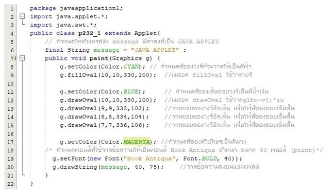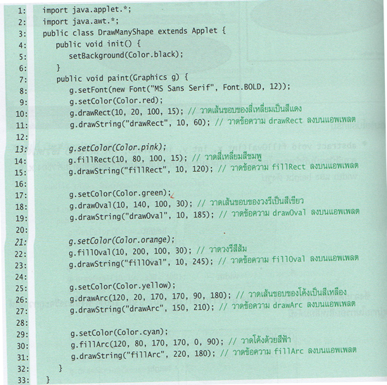 Abstract void fillOval ( int x , int y , int width , int height )ใช้วาดเส้นขอบของวงรีตามสีปัจจุบันที่กำหนด โดยจะวาดเส้นขอบของวงรีการเกี่ยวกับการวาดวงรี Abstract void setFont (Font font) ใช้กำหนดรูปแบบตัวอักษรที่ต้องการ โดยสามารถกำหนดได้ว่าจะใช้ฟอนต์ใด แสดงผลแบบใด (หนา, เอียง, ขีดเส้นใต้, ฯลฯ) และขนาดของตัวอักษรเป็นเท่าไร่ Abstract void drawString (String str , int x , int y ) ใช้วาดข้อความลงที่ตำแหน่ง ( x , y ) ของแอพเพลต