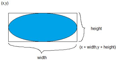 Abstract void fillOval ( int x , int y , int width , int height ) ใช้วาดวงรีตามสีปัจจุบันที่กำหนด โดยจะวาดวงรีให้อยู่ภายในกรอบสี่เหลี่ยมที่กำหนดขึ้นด้วยค่าของ x , y width และ height ดังรูป