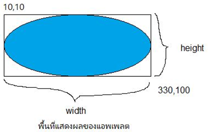 ซึ่งจากตัวอย่างด้านบน เรากำหนด g.fillOvall (10,10,330,100) ; ดังนั้นวงรีจะถูกวาดให้อยู่ภายในกรอบสี่เหลี่ยมดังนี้