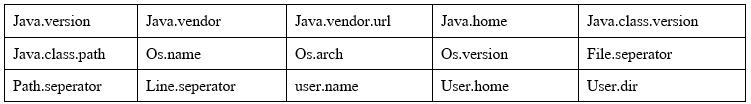 - static String getProperty(String key) เป็นเมธอดของคลาส System ที่ใช้ตรวจสอบข้อมูลต่างๆ ของระบบปฏิบัติการ (operating system) ที่ใช้งานอยู่ซึ่งจากตัวอย่างด้านบนระบุคีย์เป็น java.version เพื่อค้นหาเวอร์ชันของตัวแปลภาษาจาวาที่ใช้งานอยู่ และคีย์ java.vendor เพื่อค้นหาว่าเจ้าของผลิตภัณฑ์ (ผู้พัฒนาตัวแปลภาษาจาวา) คือใคร โดยคีย์ที่สามารถระบุให้กับเมธอด getProperty ได้มีอยู่เป็นจำนวนมาก ดังนี้