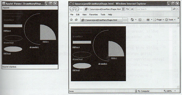 - adstract void drawArc(int x, int y, int width, int height, int startAngle, int arcAngle) การทำงานของเมธอดนี้จะเหมือนกับเมธอด fillArc เพียงแต่เมธอดนี้ใช้วาดขอบของเมธอดนี้ใช้วาดขอบของเส้นโค้ง ไม่ใช่พื้นที่ภายในโค้ง ดังนั้น จากตัวอย่างด้านบนที่ระบุวาดขอบของเส้นโค้งด้วย g.drawArcZ120, 20, 170, 170, 90, 180); จึงหมายถึง ให้เริ่มต้นวาดขอบของเส้นโค้งที่มุม 90 และวาดโค้งไปทางด้านซ้าย 180 องศา