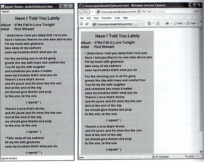 โปรแกรมนี้เป็นจาวาแอพเพลตที่แสดงเนื้อร้องพร้อมดนตรีของเพลง Have I you lately เพื่อให้ผู้ใช้ร้องคาราโอเกะ (ดนตรีมาจากไฟล์เพลงแบบ MIDI ที่ชื่อ Have I told you lately.mid) โดยในตัวอย่างนี้จะเก็บไฟล์เพลง Have I told you lately.mid ไว้ที่พาธ (path) เดียวกันกับไฟล์ AudioClipSound.html