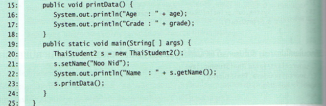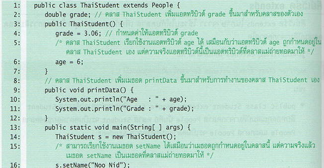 จะเห็นว่าหากไม่ทำการสืบทอดคุณสมบัติโปรแกรมก็ยังคงได้ผลลัพธ์เหมือนเดิม เพียงแต่เราต้องเขียนโค้ดมากขึ้น โดยให้สังเกตโค้ดที่เป็นตัวหนา นั่นคือส่วนที่เราต้องเขียนเพิ่มขึ้นจากคลาส ThaiStudent ในตัวอย่างที่ 14.1 ซึ่งถ้าเรานำหลักการสืบทอดคุณสมบัติมาใช้ ก็จะไม่ต้องเขียนโค้ดส่วนที่เป็นตัวหนาเพราะโค้ดส่วนนี้จะได้รับการถ่ายทอดมาจากคลาสแม่ (คลาส People)