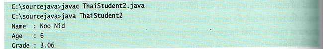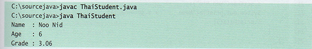 ในการสั่งคอมไฟล์โปรแรกม เราจะสั่งคอมไพล์จากคลาสที่เป็นคลาสลูกไม่ใช่สั่งคอมไพล์จากคลาสแม่ โดยเมื่อสั่งคอมไพล์คลาสลูกแล้วจะทำให้คลาสแม่ถูกคอมไพล์ไปโดยอัตโนมัติด้วย กล่าวคือ เมื่อสั่งคอมไพล์โปรแรกมด้วยคำสั่ง java ThaiStudent.java แล้ว จะทำให้คลาส ThaiStudent ถูกคอมไพล์ส่วนคลาส People ในไฟล์ People.java ก็จะถูกคอมไพล์โดยอัตโนมัติด้วย เนื่องจากคลาส ThaiStudent เรียกสืบทอดคุณสมบัติมาจากคลาส People
