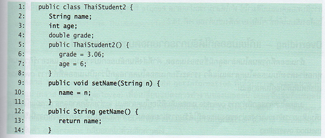 ยกตัวอย่าง เช่น จากตัวอย่างที่ 1 สมมติว่าผู้เขียนไม่นำหลักการของการสืบทอดคุณสมบัติมาใช้มาดูกันว่าคลาส ThaiStudent ที่สร้างขึ้นเป็นอย่างไร