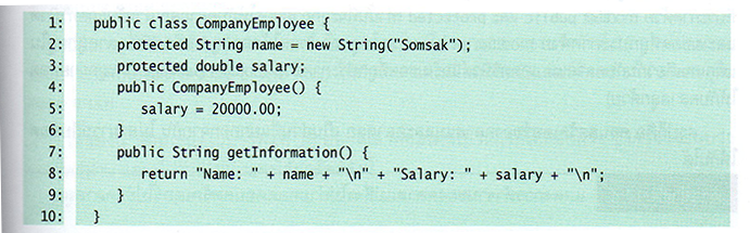- public class Manager extends Employee { } เป็นการกำหนดให้คลาส Manager สืบทอดคุณสมบัติมาจากคลาส Employee นั่นคือ คลาส Manager จะเป็นคลาสลูกของคลาส Employee และคลาส Employee จะเป็นคลาสแม่ของคลาส Manager