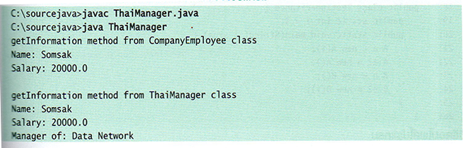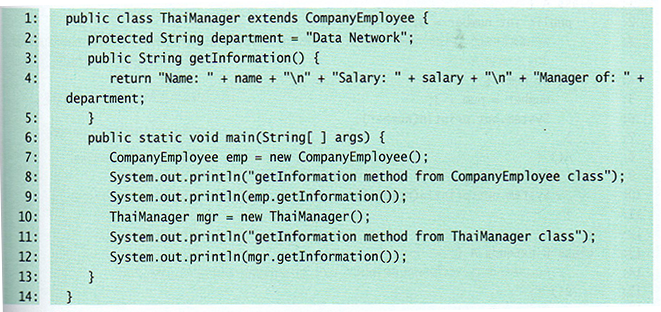 คลาส ThaiManager ทำการ override เมธอด getInformation ที่ได้รับการถ่ายทอดมาจากคลาสแม่ (คลาส CompanyEmployee) เพื่อเปลี่ยนแปลงการทำงานของเมธอดนี้ โดยจากเดิมที่เมธอดนี้มีการกำหนดแอตทริบิวต์ department ขึ้นมาด้วย ดังนั้นเมธอด getInformation ในคลาส ThaiManager จึงคืนค่า department กลับออกไปด้วยอีกค่าหนึ่ง