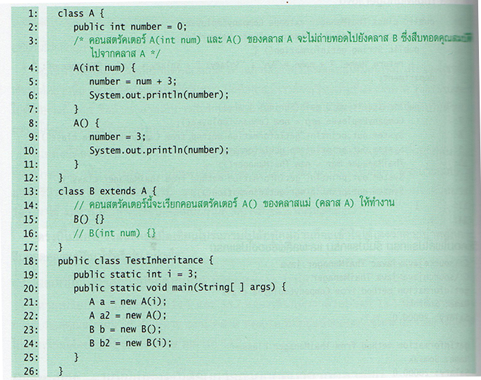 แม้ว่าคลาส B จะสืบทอดคุณสมบัติมาจากคลาส A ก็ตาม แต่คอนสตรัคเตอร์ A(int num) ในบรรทัดที่ 4-7 จะไม่ถูกถ่ายทอดไปยังคลาส B กล่าวคือ จะไม่มีคอนสตรัคเตอร์ B(int num) ถูกสร้างขึ้นโดยอัตโนมัติเพื่อให้เรียกใช้งาน